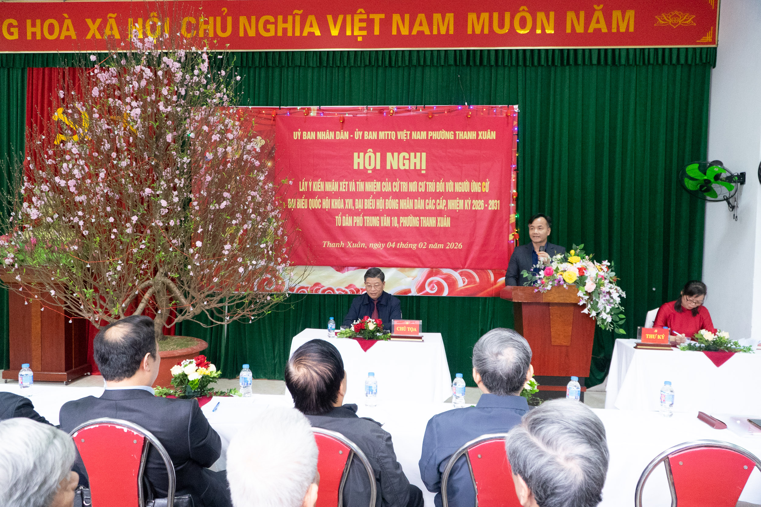Đại diện các cơ quan công tác của những người ứng cử trên địa bàn phường Ngọc Hà, Phó Bí thư Đảng ủy Quốc hội Phùng Khánh Tài bày tỏ vui mừng, trân trọng khi nghe bà con cử tri thể hiện những tình cảm chân thành, sự ủng hộ, tín nhiệm đối với 5 đồng chí ứng cử đại biểu Quốc hội khóa XVI và đại biểu HĐND các cấp nhiệm kỳ 2026 - 2031, nhất là việc các đồng chí được giới thiệu làm ứng cử viên đã giữ mối liên hệ chặt chẽ, gắn bó, tham gia trách nhiệm các công việc của địa phương, cộng đồng dân cư nơi sinh sống. Đồng thời, các ý kiến cũng tin tưởng và gửi gắm niềm tin, kỳ vọng đối với những đóng góp của các ứng cử viên nếu được bầu làm đại biểu Quốc hội và HĐND. Phó Bí thư Đảng ủy Quốc hội Phùng Khánh Tài đề nghị các ứng cử viên lắng nghe, tiếp thu và luôn nỗ lực phấn đấu để không phụ lòng tin của bà con cử tri và Nhân dân.