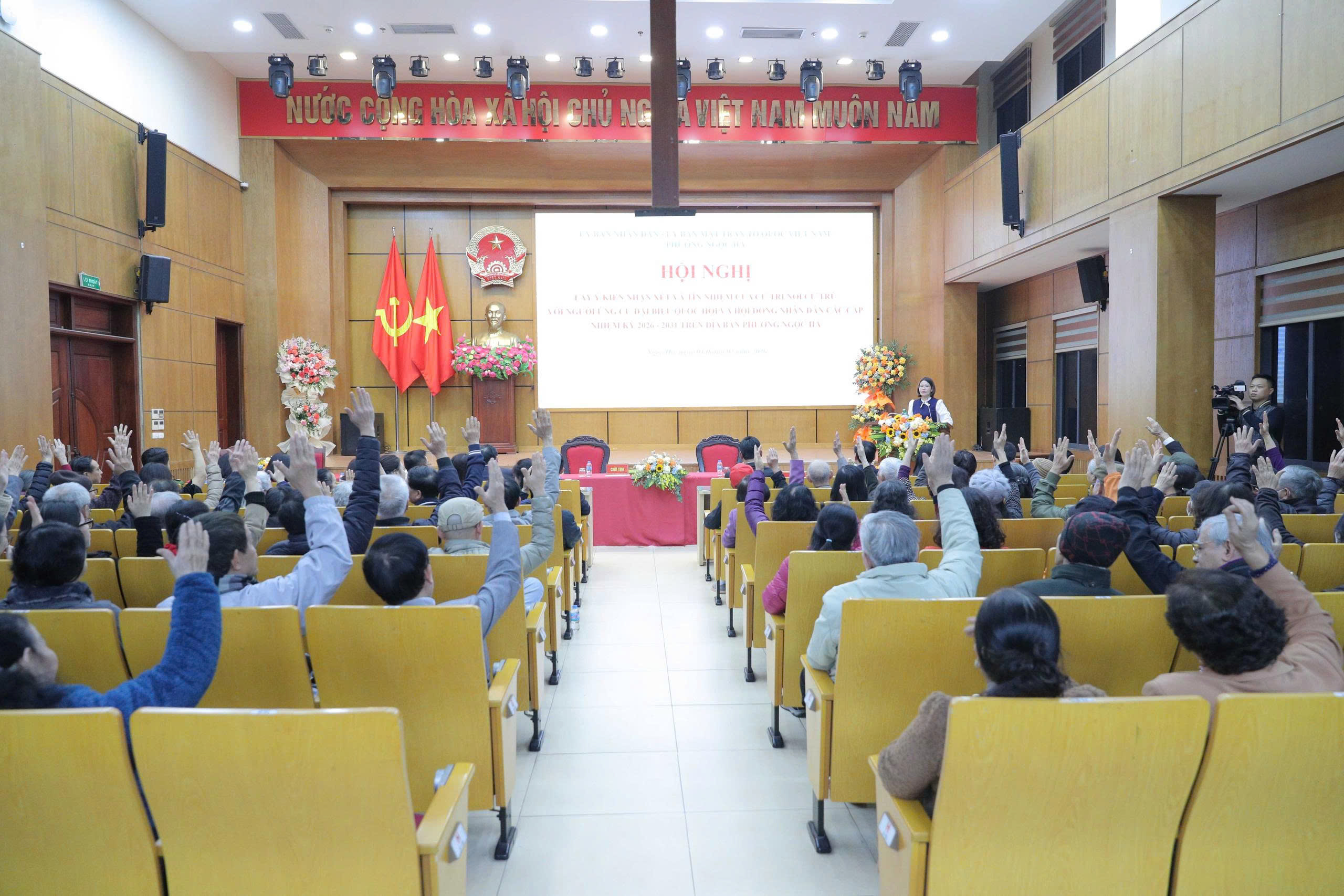 Tối 4/2, tại Hà Nội, Ủy ban Mặt trận Tổ quốc Việt Nam phường Ngọc Hà và UBND phường Ngọc Hà tổ chức Hội nghị lấy ý kiến nhận xét và tín nhiệm của cử tri nơi cư trú đối với người ứng cử ĐBQH khóa XVI và đại biểu HĐND các cấp nhiệm kỳ 2026 - 2031 trên địa bàn phường Ngọc Hà. Ủy viên Trung ương Đảng, Phó Bí thư chuyên trách Đảng ủy Quốc hội Vũ Hải Hà và Phó Bí thư Đảng ủy Quốc hội Phùng Khánh Tài dự Hội nghị.