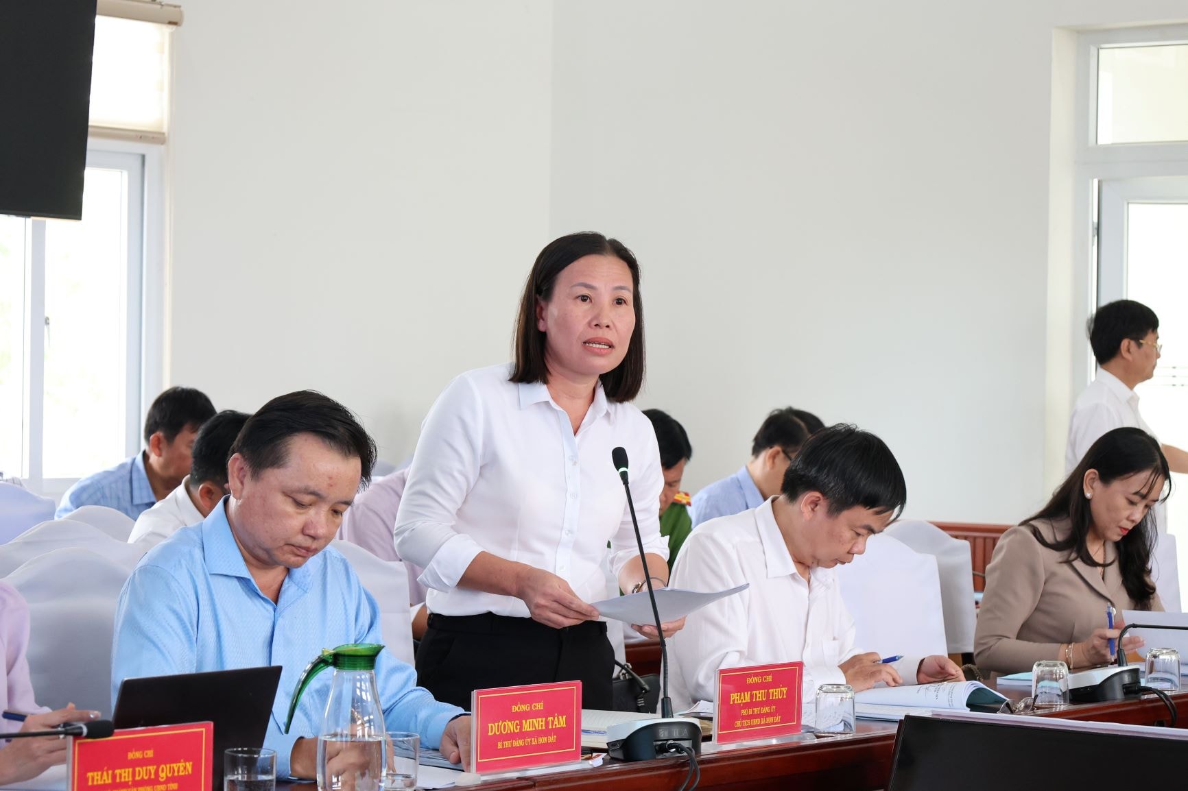 Chủ tịch UBND xã Hòn Đất Phạm Thu Thủy báo cáo về công tác chuẩn bị tổ chức bầu cử ĐBQH khóa XVI và đại biểu HĐND các cấp nhiệm kỳ 2026 - 2031