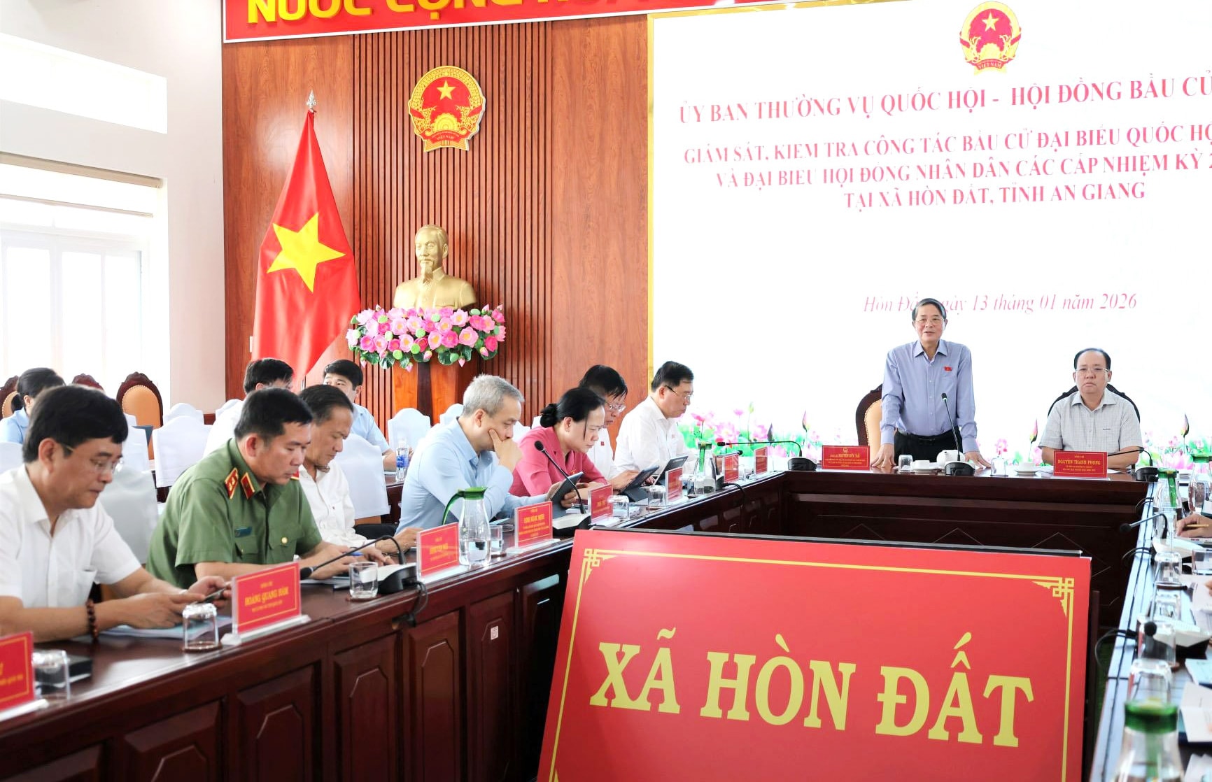 Chiều 13/1, tiếp tục các hoạt động tại An Giang, Đoàn giám sát, kiểm tra về công tác bầu cử ĐBQH khóa XVI và đại biểu HĐND các cấp nhiệm kỳ 2026 - 2031 của Ủy ban Thường vụ Quốc hội và Hội đồng Bầu cử quốc gia do Ủy viên Trung ương Đảng, Phó Chủ tịch Quốc hội Nguyễn Đức Hải - Ủy viên Hội đồng Bầu cử quốc gia, Trưởng Tiểu ban Thông tin, tuyên truyền trực thuộc Hội đồng bầu cử Quốc gia, làm Trưởng đoàn đã làm việc với Ủy ban Bầu cử xã Hòn Đất.