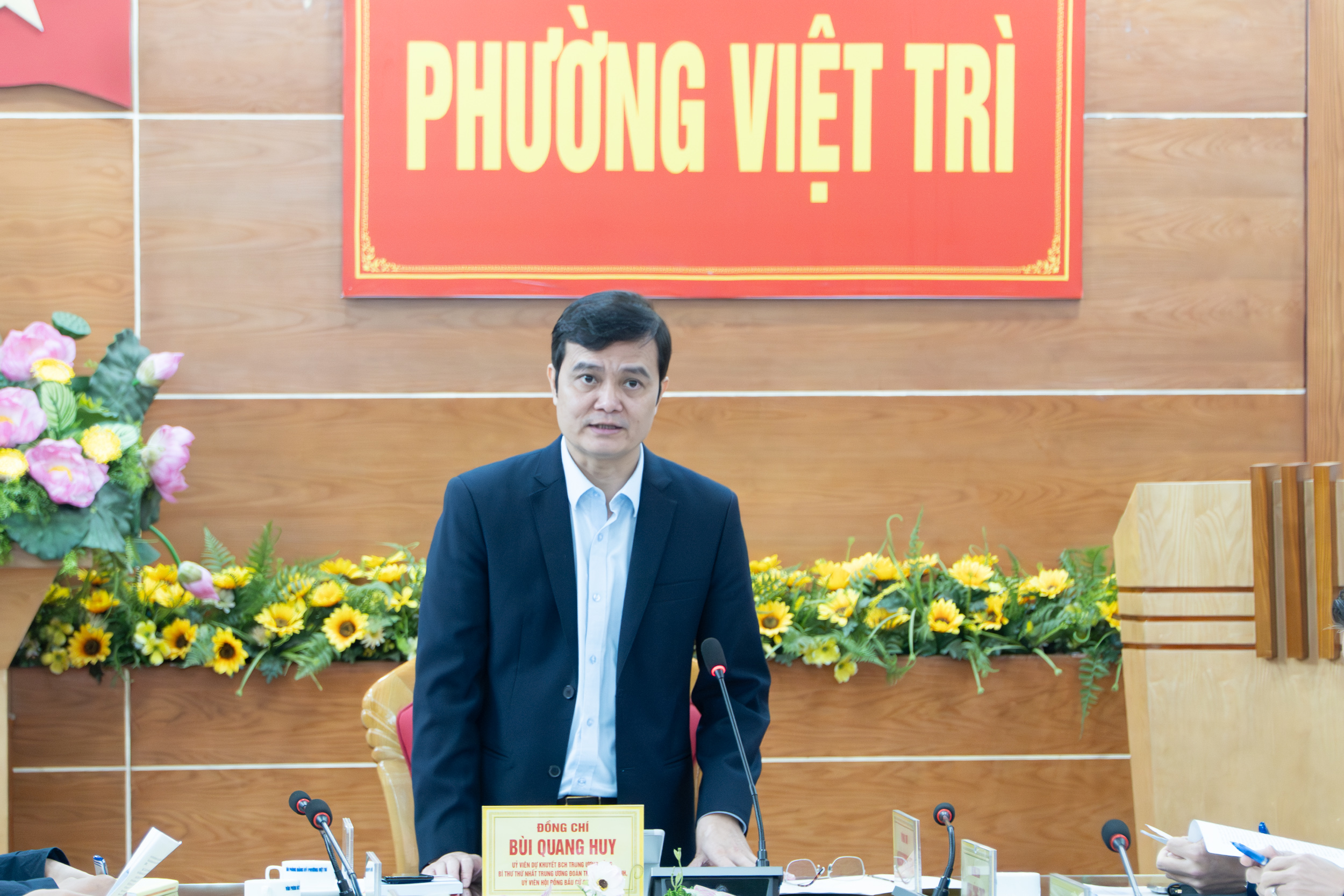 Bí thư thứ nhất Trung ương Đoàn Thanh niên Cộng sản Hồ Chí Minh, Ủy viên hội đồng bầu cử quốc gia Bùi Quang Huy phát biểu tại cuộc làm việc với phường Việt Trì, tỉnh Phú Thọ